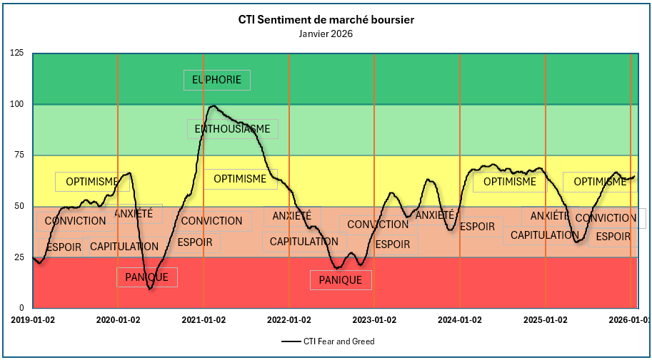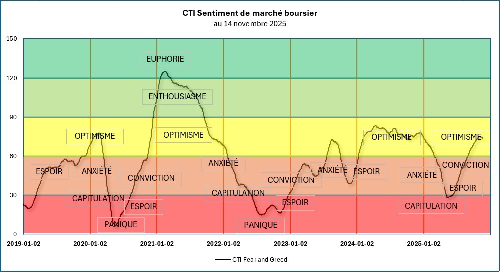 Prendre le pouls du marché à travers le sentiment des investisseurs demeure un levier stratégique essentiel pour anticiper les dynamiques de flux, capter les phases d’euphorie ou de stress et optimiser le positionnement tactique des portefeuilles. Chez CTI, notre modèle quantitatif propriétaire de mesure du sentiment agrège en temps réel des indicateurs comportementaux, des données de volatilité, des signaux de momentum et des paramètres macro-financiers afin de produire une lecture synthétique et exploitable du climat de marché. Ce cadre analytique nous permet de transformer un environnement souvent bruité en un signal opérationnel clair, soutenant une prise de décision rigoureuse et proactive.