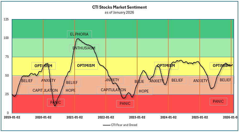 Taking the pulse of the market through investor sentiment remains a strategic lever for anticipating flow dynamics, identifying phases of euphoria or stress, and optimizing the tactical positioning of portfolios. At CTI, our proprietary quantitative sentiment model aggregates real-time behavioral indicators, volatility measures, momentum signals, and macro-financial parameters to deliver a concise and actionable readout of market conditions. This analytical framework enables us to convert a noisy environment into a clear operational signal, supporting disciplined and proactive decision-making.